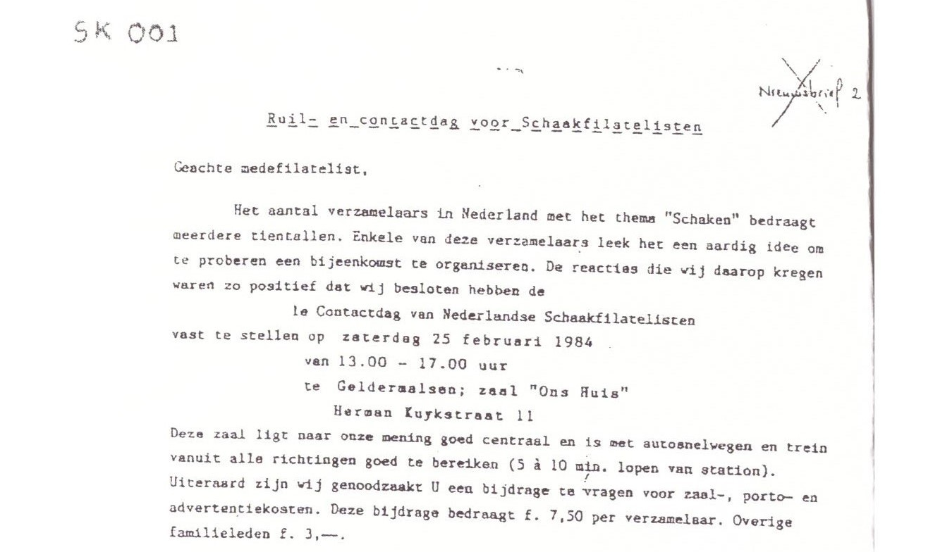 Schaakkoeriers vanaf de beginjaren: "Om maar te beginnen bij de oude Schaakkoeriers met nummer 1; die bestaat niet! Nummer 1 zou bestaan uit een nieuwsbrief 2 waarin dit doorgestreept is en links bovenaan SK001 staat geschreven. In deze nieuwsbrief 2 worden verzamelaars uitgenodigd om de 1e contactdag op zaterdag 25 februari 1984 bij te wonen in zaal ‘Ons Huis’ te Geldermalsen. Het tijdstip was van 13.00 -17.00 uur en de bijdrage was Fl. 7,50 per verzamelaar. De brief was ondertekend door N.J. Cranendonk en Sj. v. Ketel. ............." |