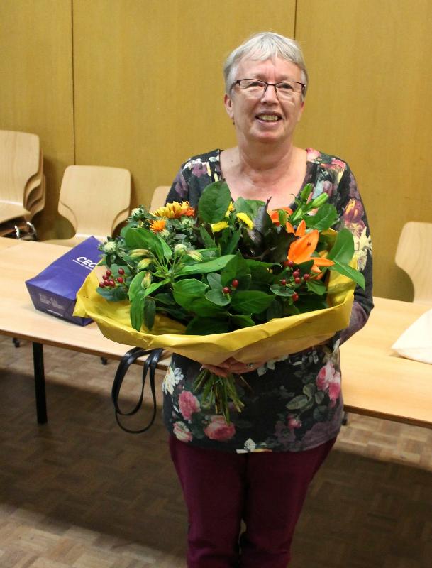 En na de veiling was er eerst een namens de vereniging welgemeend bloemetje voor Marja Bijpost, die als niet verenigingslid al jarenlang de guldenpostzegels voor de verzending van de Schaakkoerier sorteert en plakt.