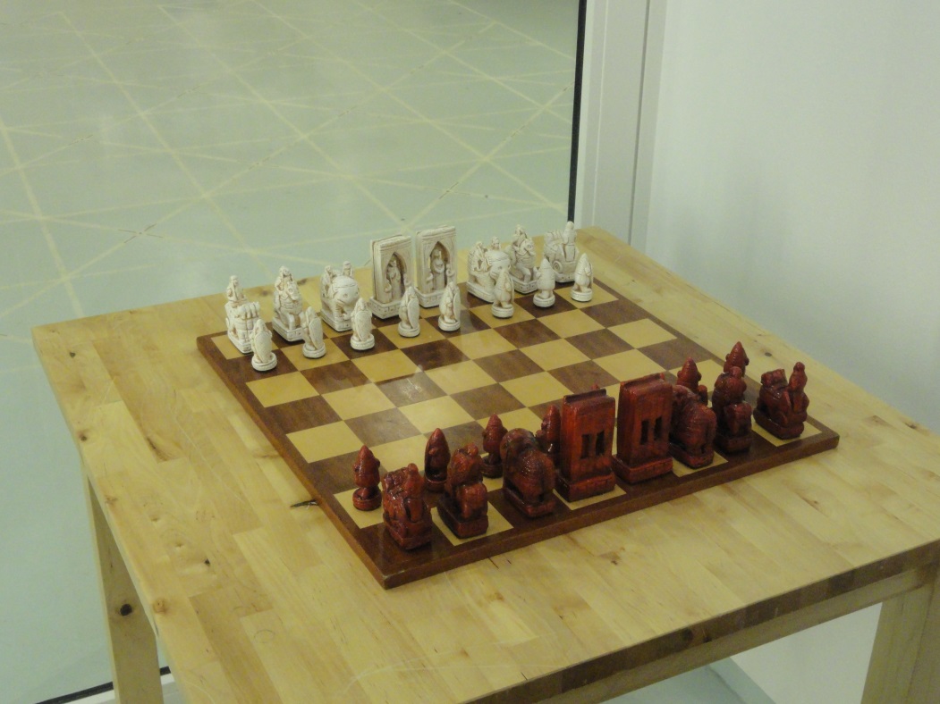 | Zondagmiddag daarna werd in de kelder van het Museum het Valkhof een simultaan gegeven met enkele middeleeuwse regels door in middeleeuws gestoken grootmeester Friso Nijboer (l) en International Meester Hans Klip (r). Met standaard Staunton stukken werd gespeeld zonder: eerste twee pionzet, rokade en en-passant. Deze latere toevoegingen op de middeleeuwen maken het spel trager. Vooral kinderen en jongeren gingen de uitdaging aan met Nijboer en Klip. Uiteindelijk won een jongen uit Utrecht. Ook kon er vrij gespeeld worden met een replica’s van het Lewis spel, en Charlemagne spel alla Karel de Grote. Friso en Hans waren erg enthousiast over de eerste mogelijkheid om zo’n nieuwe spelvariant op te stellen. Volgend jaar komen ze graag terug. | |