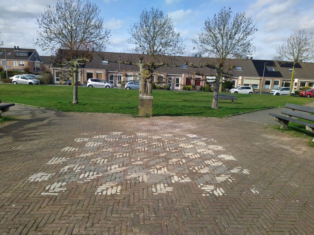 Midden in de speeltuin, tegenover het beeldje ‘De ontmoeting’ is met witte en zwarte verf een schaakdamspel getekend op het vierkante stenen midden van het speelveldje.